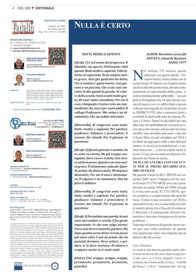 FEDELTÀ DEL SUONO #320 – NOVEMBRE 2022 – NULLA È CERTO