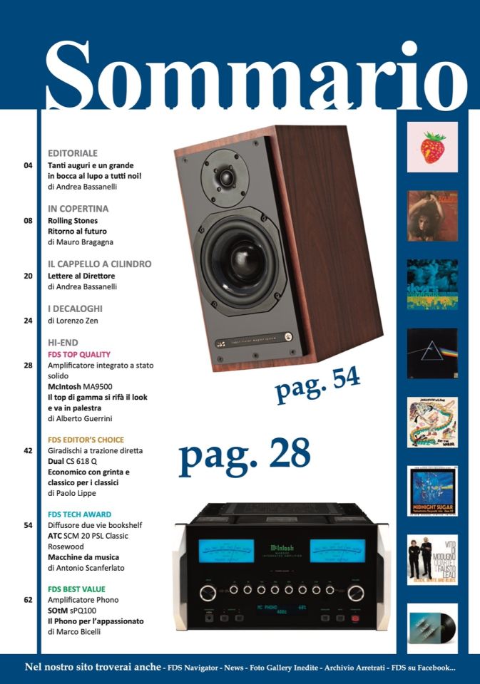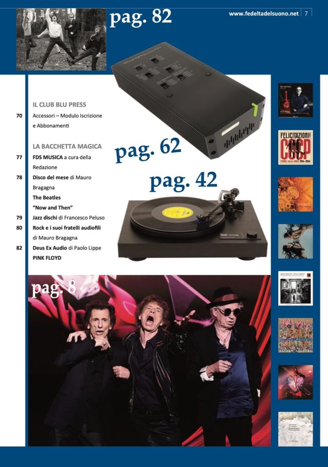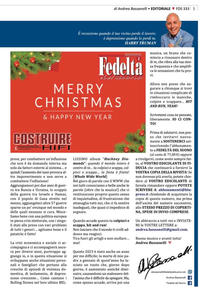 Prima di salutarvi, non posso che invitarvi nuovamente a SOSTENERCI sottoscrivendo l’abbonamento a FEDELTÀ DEL SUONO (al costo di 75,00 €) oppure a rivolgervi, come avete sempre fatto, al VOSTRO EDICOLANTE DI FIDUCIA che continuerà a fornirvi la VOSTRA COPIA DELLA RIVISTA! Se non dovesse più averla, potete chiedere al VOSTRO EDICOLANTE di farsela rimandare oppure POTETE SCRIVERE A: abbonamenti@blupress.it chiedendo di acquistare la copia di questo numero, ma prima dell’uscita del numero successivo, allo STESSO PREZZO DI COPERTINA, SPESE DI INVIO COMPRESE.